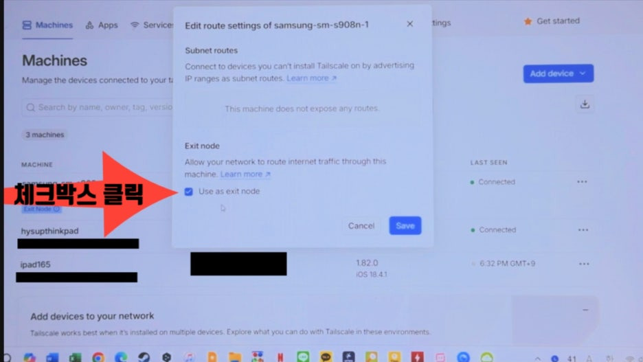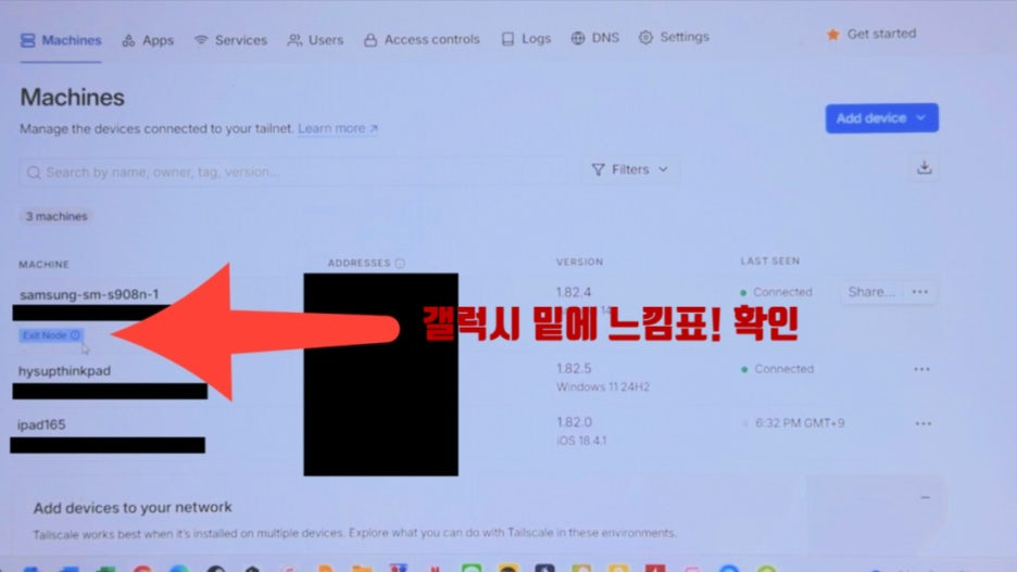 아까 갤럭시에서 Run as exit node를 활성화시켜줬잖아요? 그럼 갤럭시 밑에 Exie node!라는 문구가 있을 겁니다. 느낌표가 있어야 합니다.