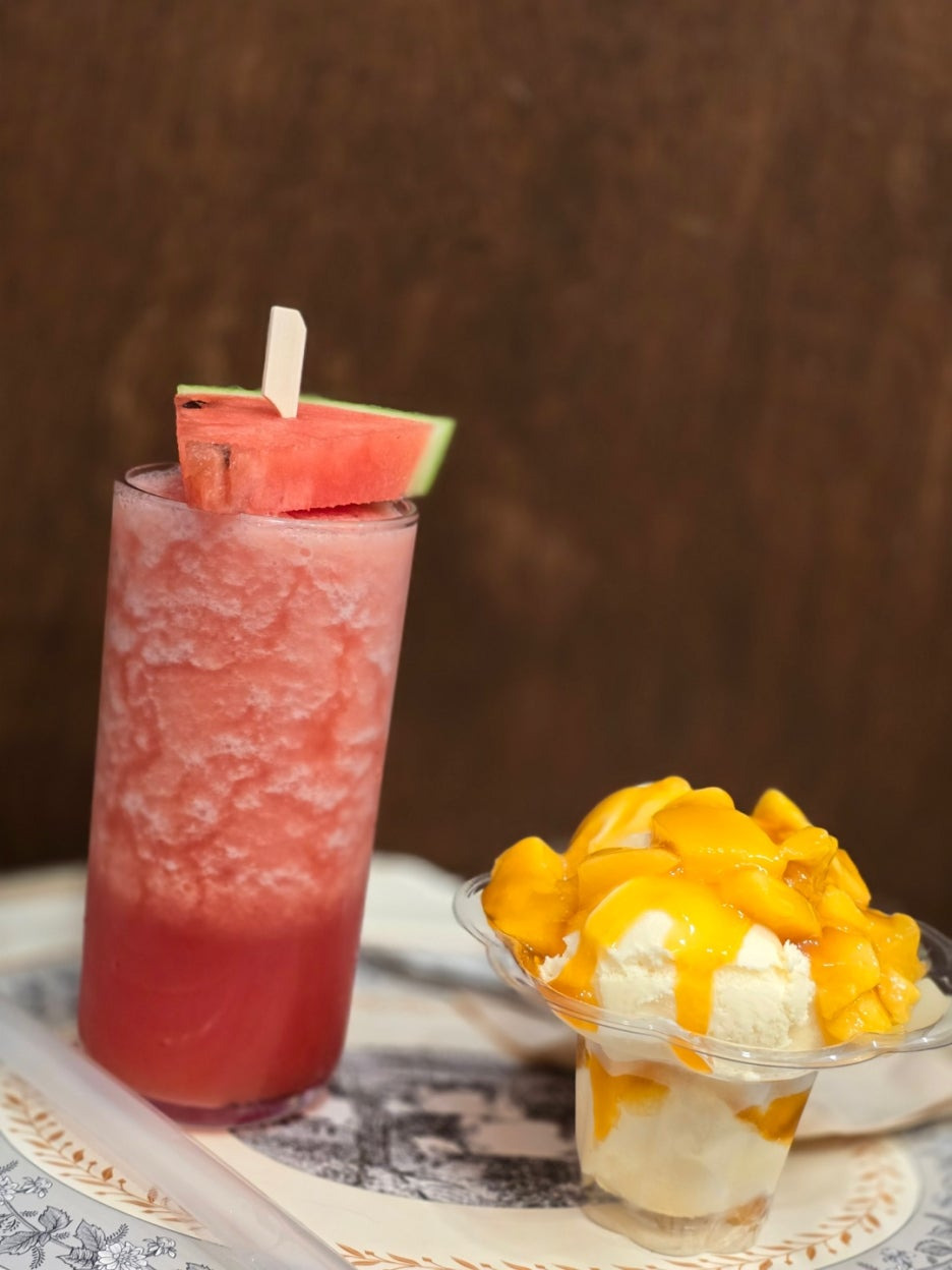 너무 더워서 빨리 갈증을 해소하고 싶었어요. 일단 수박주스를 마시고 싶어서 온 만큼 수박주스 하나 시켰구요. 여름에는 또 망고 아니겠습니까? 망고 아이스크림도 하나 주문해 보았습니다.