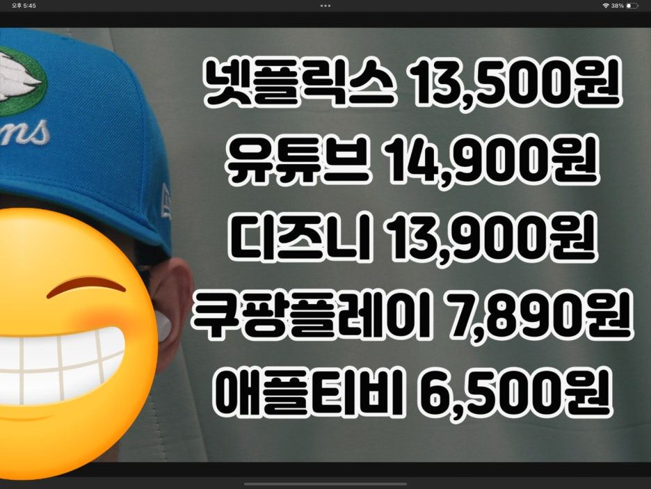 게다가 저처럼 보지도 않는 OTT 구독만 주구장창 하시는 분들 많이 계실겁니다. 저만 해도 넷플릭스, 유튜브, 디즈니플러스, 쿠팡플레이, 애플티비까지...