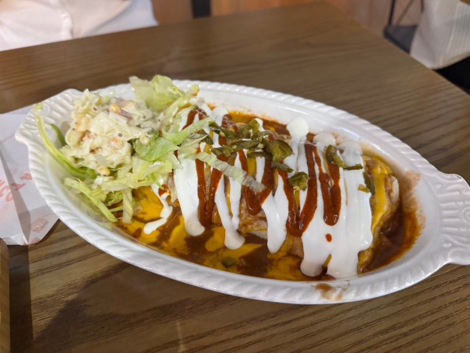 간단히 말하자면, 또르띠야 안에 속 재료 꽉꽉 넣고, 매콤한 소스를 끼얹어 먹는 음식이에요. 느끼함 없이 계속 먹을 수 있어서 좋아요.
