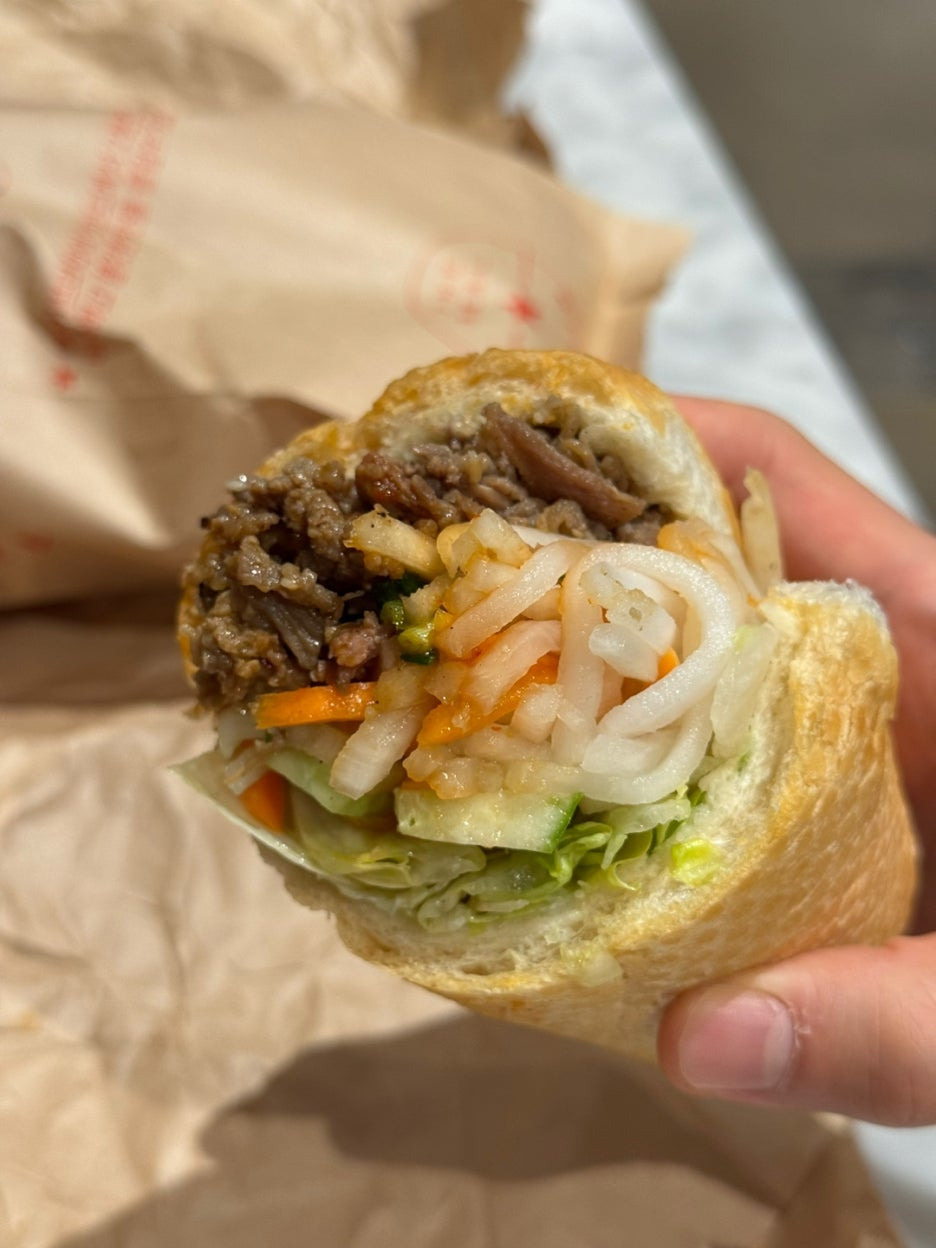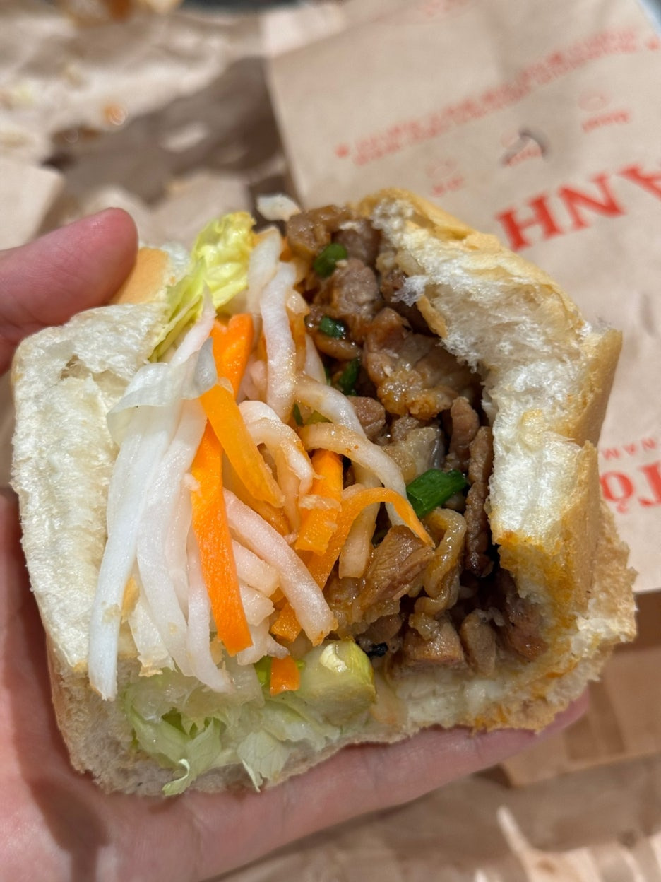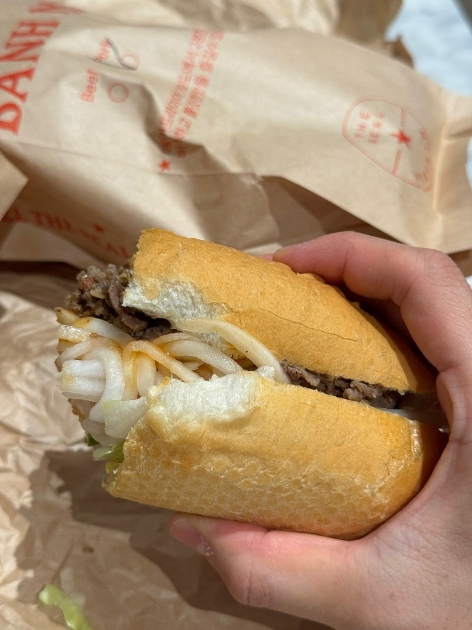 이거 한입에 넣으면 어떤 맛이냐! 아삭아삭함과 매콤함이 입안에 싹 퍼진다고!!! 왜 이렇게 맛있냐고. 진짜 그동안 한국에서 먹은 반미 중에 제일 맛있어요.