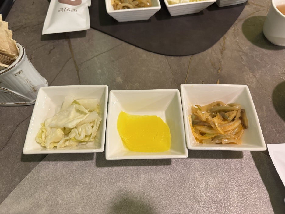 일단 기본 반찬이 세 가지나 나오네요. 졸인 양배추, 단무지, 짜사이... 단무지만 줘도 감지덕지인데 무려 졸인 양배추와 짜사이까지 ㅠㅠ. 넘넘 맛있어용.